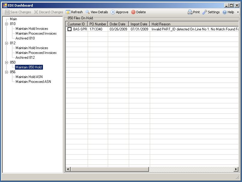 Upon selecting a node you will see the main body of the window updated and the toolbar options will be activated as appropriate.  Here I have selected the "Maintain 850 Hold" node and I can see a single inbound transaction on hold: