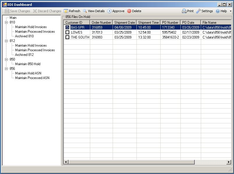 The heart of our offering is a new module installed in your Visual® main menu called EDI Dashboard.  This tool is the graphical interface used to review, edit, and approve transactions.  As mentioned in the previous section, depending on how you implement, you may see only the errant transactions here or all transactions.