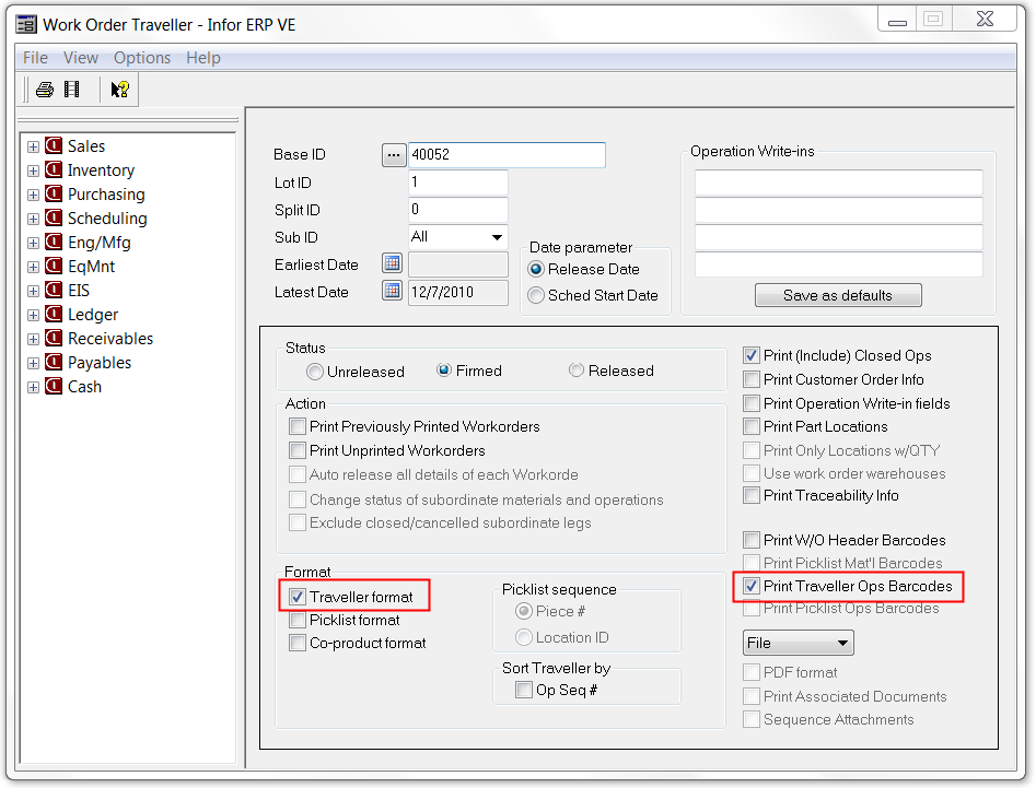The first step in using this application will be to print a Work Order Traveller out of Visual® in Traveller format with the 'Ops Barcodes' (you will probably be doing this already):