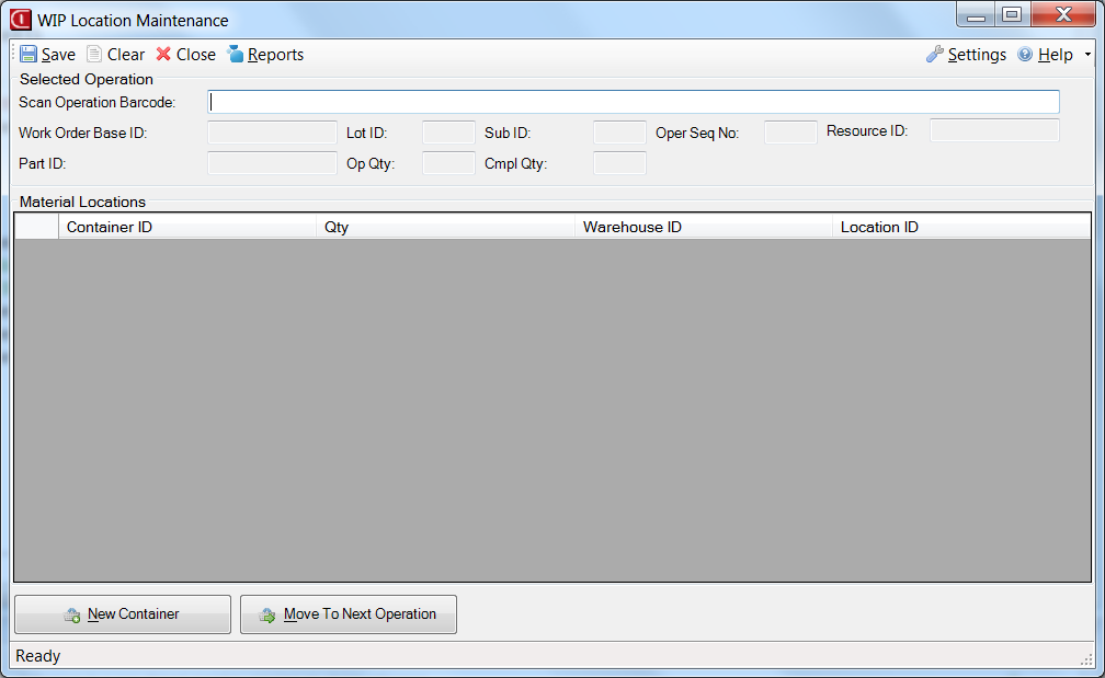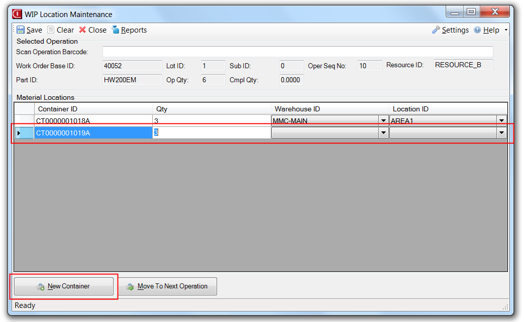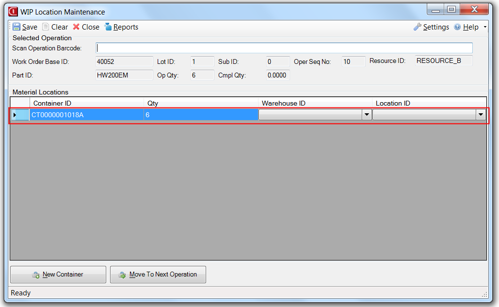At this point you would likely leave this work order as-is until you need to recall it at a later time to move it. As long as you have saved your changes you can simply close this screen. When you decide to move this inventory to the next operation you will need to re-launch this program, scan the barcode for the current operation, highlight the containers in the material locations grid you wish to move, and press the 'Move To Next Operation' button. If a next operation is available, the inventory will move to that next operation. If this is the last operation we will mark our container with a status of 'C' for closed and it will no longer show up on any screens.