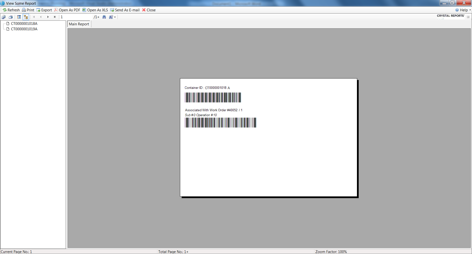 The next thing you might wish to do at this point is print off container labels. This can be accomplished using the built-in Logicity integration. This will be described in full detail later on, but in short you can hook up any Crystal Report to this screen and the currently selected work order base ID, lot ID, sub ID, and operation sequence number can be passed into the report.