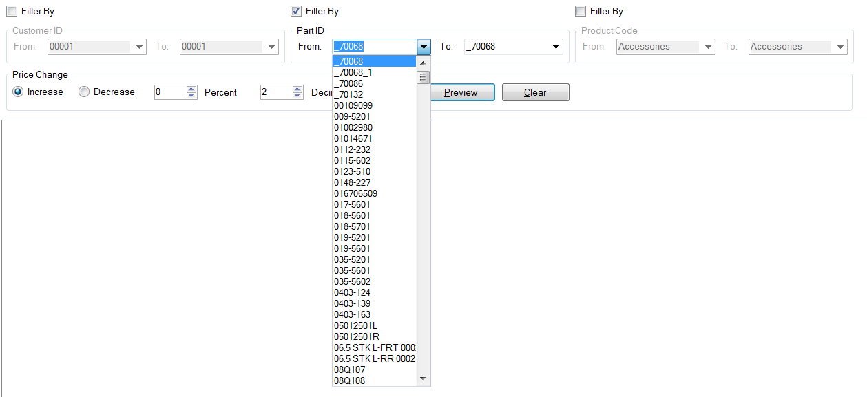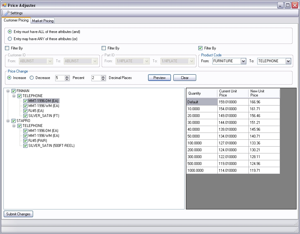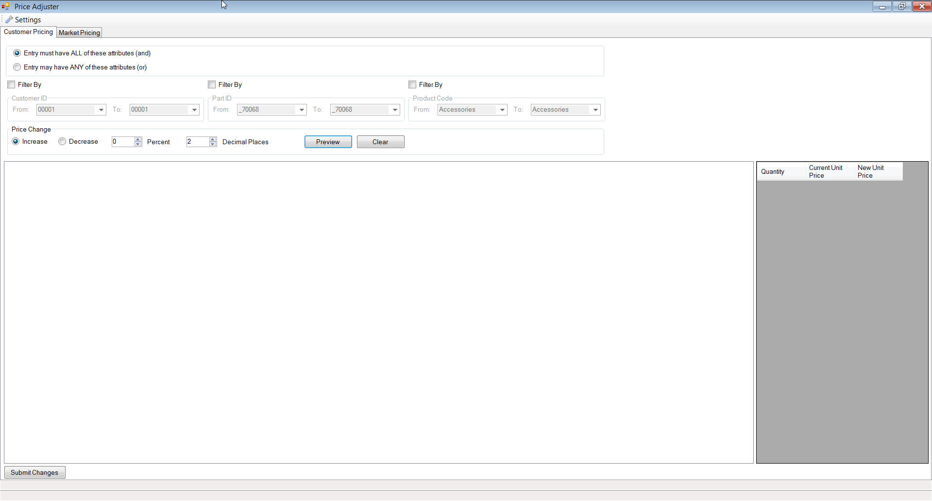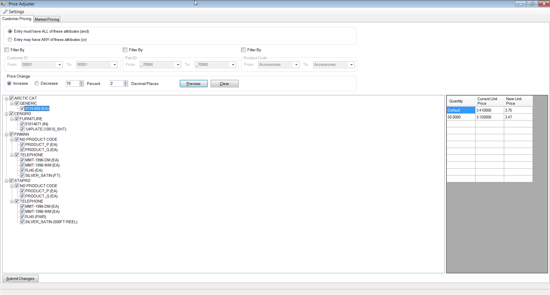 Price Adjuster is a mass update routine for more efficient management of customer and market pricing in Infor VISUAL© Enterprise / Infor 10 ERP Express. This solution allows you to filter based on customer, part and/or product group combinations to build up a set of customer/part combinations which you desire to have customer pricing adjusted up or down by a certain percentage. You have the opportunity to review the proposed changes, uncheck any entries you do not wish to update, or manually edit the new prices for any entries, and then submit the changes into VISUAL©.